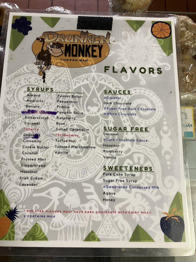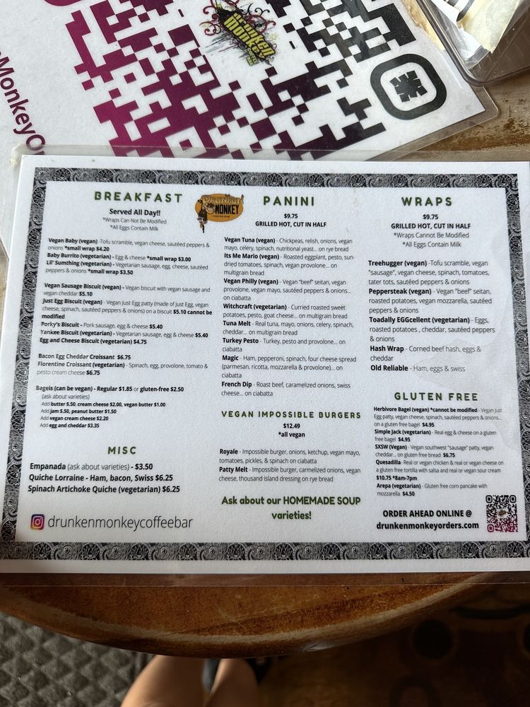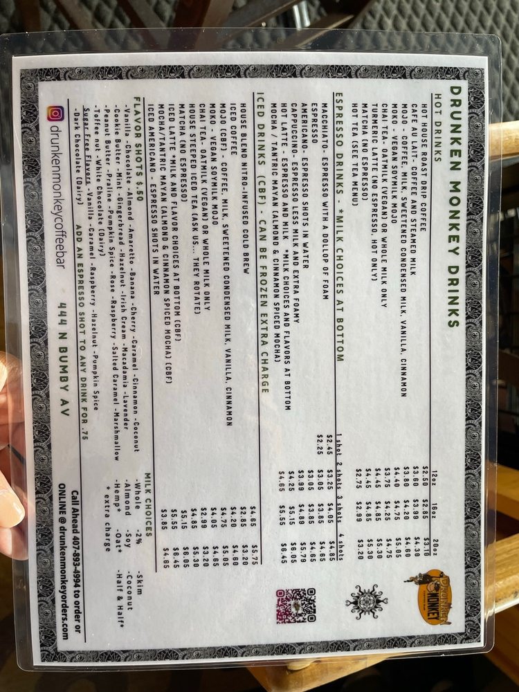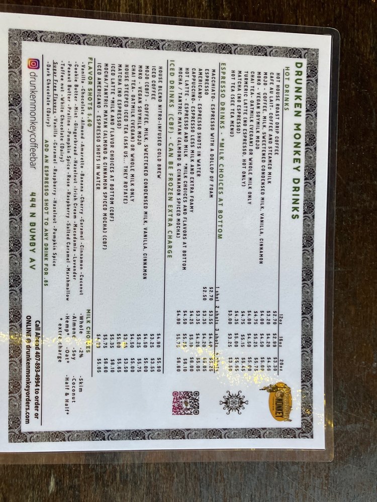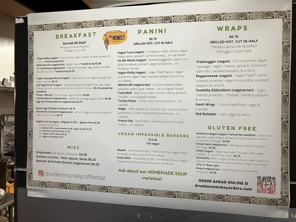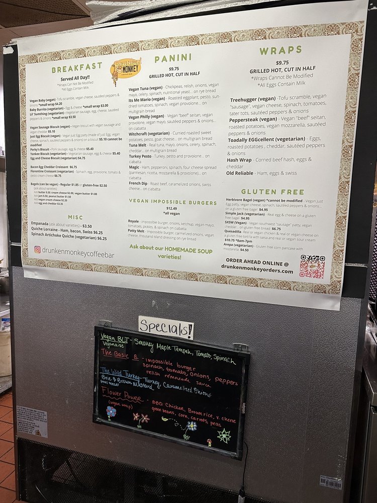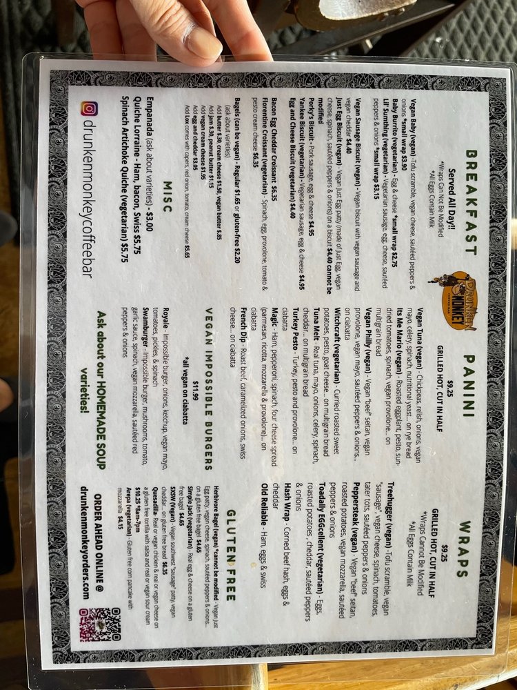 Drunken Monkey Coffee Bar in Orlando, FL, offers a unique blend of vegan, vegetarian, and non-vegetarian options. The menu includes items like the Witchcraft panini with curried sweet potatoes, goat cheese, and pesto, along with vegan pepper steak wraps and French dip sandwiches. The cozy ambiance, complete with quirky decor and local art, provides a welcoming space for customers. Reviewers praise the friendly staff, decent coffee, and clean restrooms, making it a standout spot for a relaxing meal or coffee break. With options for takeout, delivery, and catering, Drunken Monkey caters to various preferences and dietary needs. Don't miss out on their vegan pastries and specialty drinks, like the mojo jojo iced coffee. Experience a taste of the 90s-era coffee shop vibe and indulge in the flavorful offerings at this neighborhood gem.